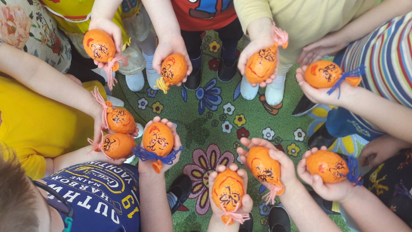 Нам понадобится: воздушный шарик оранжевого цвета (лучше без какой-либо картинки), горох, чайная ложка, воронка, перманентный несмываемый маркер, разные ленточки, разноцветная шерсть (для украшения).