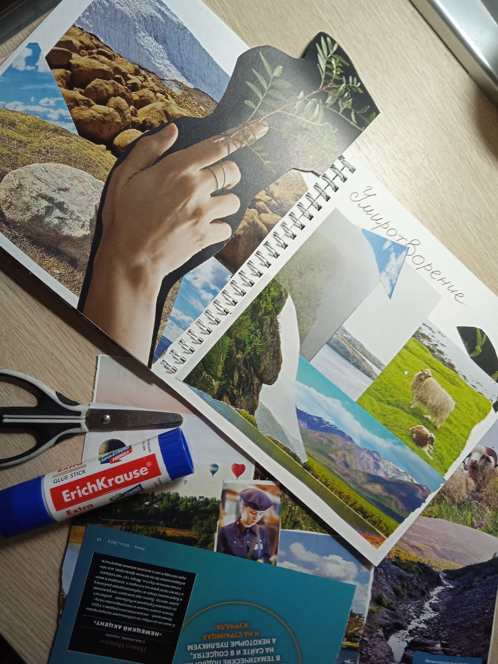 4. Коллаж может быть в рамках альбома, а может чуть выходить за границы. Здесь нет чётких правил. Главное отдаться работе, погрузиться в неё, отслеживать свои чувства, состояние. Если вам некомфортно, подумайте, что вызывает дискомфорт, можно ли что-то изменить, чтоб его устранить, либо лучше отложить создание коллажа на другое время.