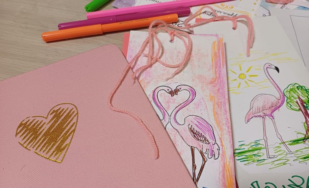 ХОД РАБОТЫ — Посмотрите фото и видео материалы, где встречается образ розового фламинго, послушайте песни об этой птице. Розовый фламинго в данном случае будет выступать как символ надежды, вдохновения, позитивного восприятия себя и окружающего мира. — Выберите из готовых шаблонов с изображением розового фламинго наиболее вам подходящий и вырежьте по контуру – это будет ключевым изображением («обложкой») будущей закладки. При желании можете самостоятельно нарисовать «своего» розового фламинго; — Вырежьте из белого картона прямоугольник примерно 9 х 21 см, а затем из бумаги меньшей плотности (розового цвета) ещё три аналогичных прямоугольника – это будет основой будущей закладки; — Скрепите вырезанные прямоугольники между собой с помощью плотных ниток розового цвета – получатся своего рода «страницы». Прямоугольник, вырезанный из картона при этом должен идти первым, за ним прямоугольники из менее плотной бумаги. — Приклейте на «обложку» закладки изображение фламинго (нарисуйте сами); раскрасьте; сделайте декор. — Следующие три «страницы» закладки будут символизировать ваше прошлое, настоящее и будущее (их можно так и подписать). Начните заполнять страницы следующим образом: подумайте с чем ассоциируется у вас тот или иной промежуток времени и подберите соответствующие образы (это могут быть вырезки из журналов/календарей; распечатанные на принтере или написанные от руки слова, обозначающие конкретные чувства, состояния души); выписанные из прочитанной литературы цитаты, которые вам оказались близки. — Вложите получившуюся закладку в свой еженедельник или книгу, которую читаете и старайтесь чаще продолжать подобным образом заполнять страницы, находя что-то близкое и созвучное. При желании количество страниц или их размер можно увеличить.