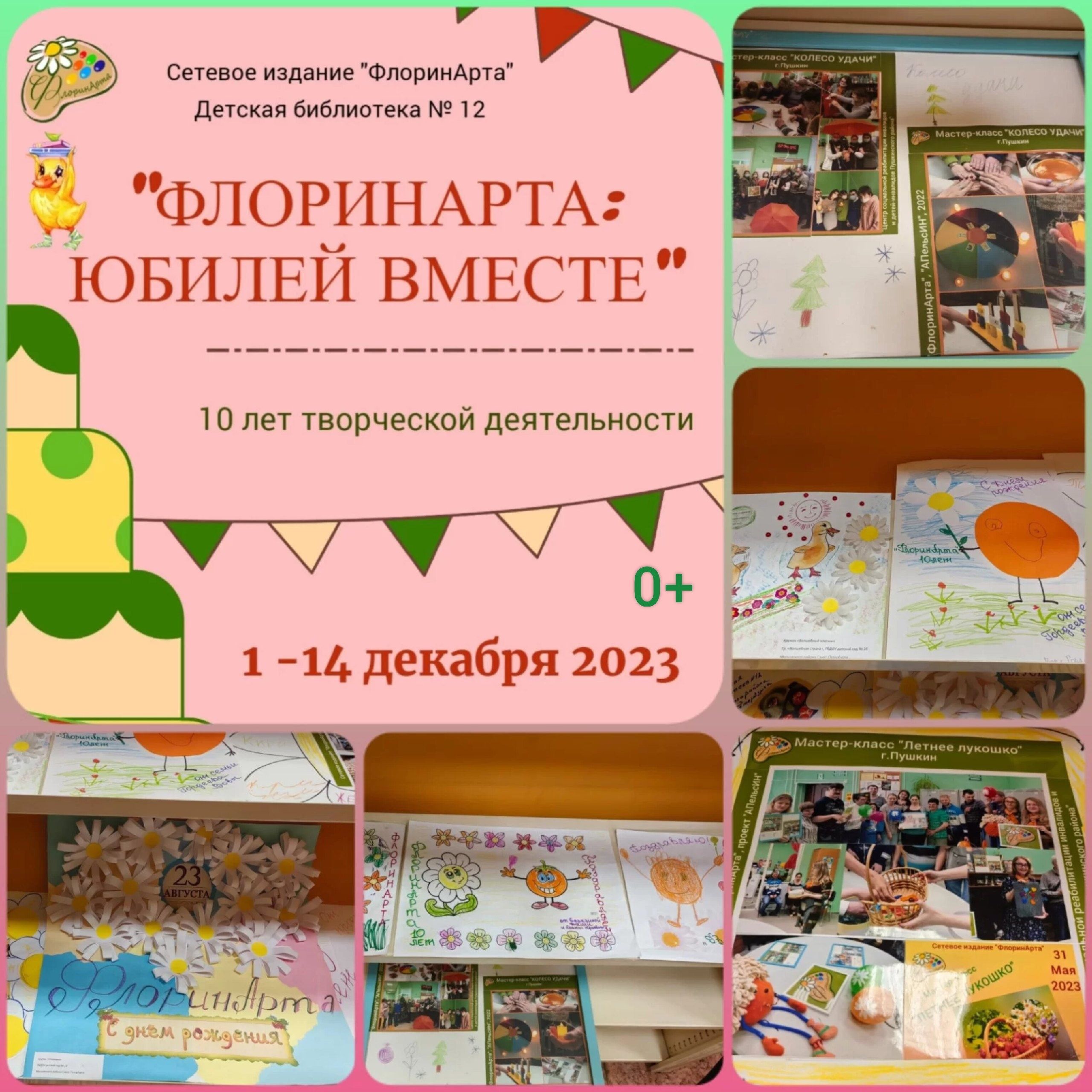 На площадке наших друзей, в детской библиотеке №12 Невского района Санкт-Петербурга, открыта выставка «ФлоринАрта: юбилей вместе». Часть экспозиции ранее можно было увидеть на выставке «Осенняя палитра — 2023», а новые творческие работы представлены как в рамках празднования 10-летия сетевого издания «ФлоринАрта», так и конкурса «Ромашки в Уткиной заводи».