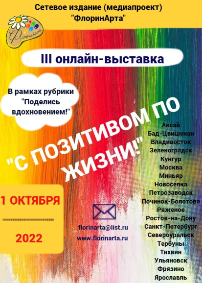 Сегодня в рамках сетевого издания (медиапроекта) «ФлоринАрта» и рубрики «Поделись вдохновением!» мы открываем третью онлайн-выставку с жизнеутверждающим названием «С позитивом по жизни!»
