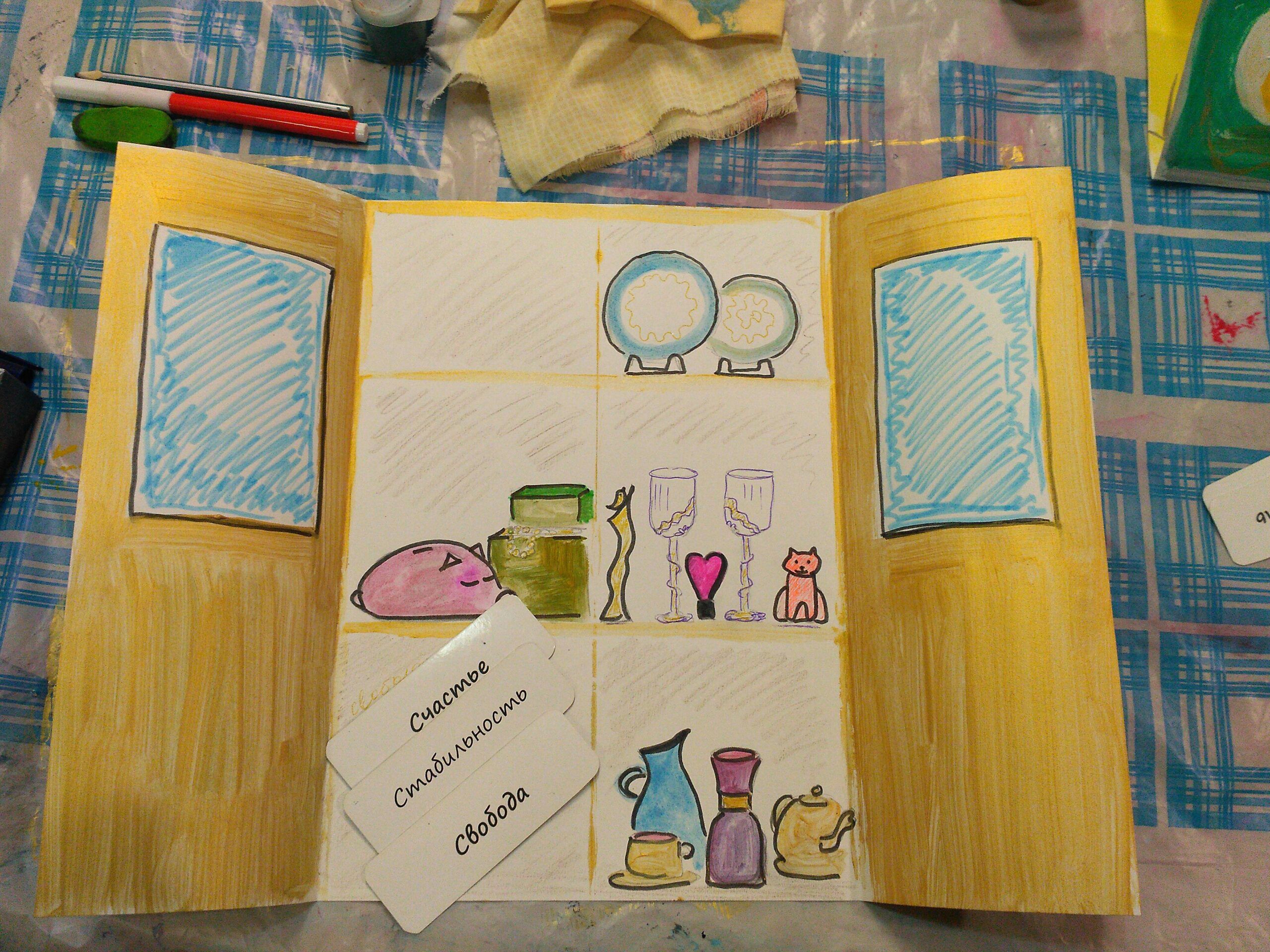 Материалы: лист А3, изобразительные материалы, метафорические карты со словами/фразами, либо интересные короткие цитаты и афоризмы из книг/интернета.
