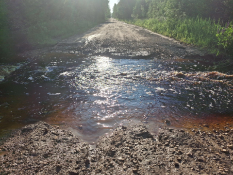 14 июня 2025г. Ленинградская область. Гатчинский район. Дорога Новинка- Дружная горка. Река Оредеж вышла из берегов и, чтобы не затопить поселение Сиверский, там открыли плотину. Преградивший нам путь поток соединил реки Оредеж и Ракитинка.
