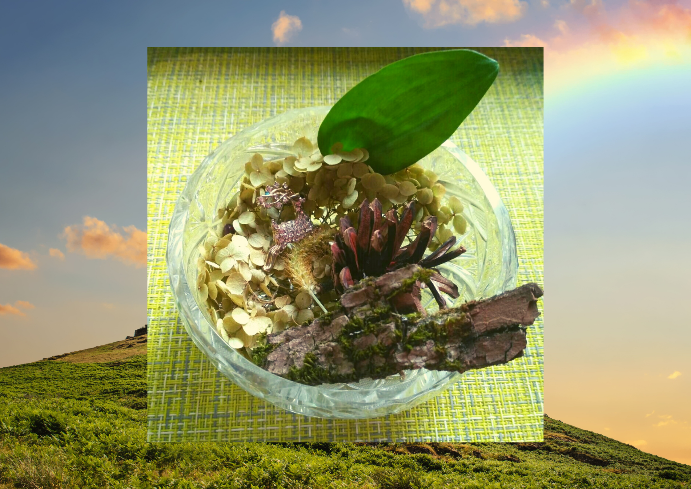 Возможно, радость у вас будет желтым березовым листочком, вдохновение – сосновой шишкой, любимое хобби – мягким зеленым мхом. Наполните вашу чашу до краев . Посмотрите на получившуюся композицию.