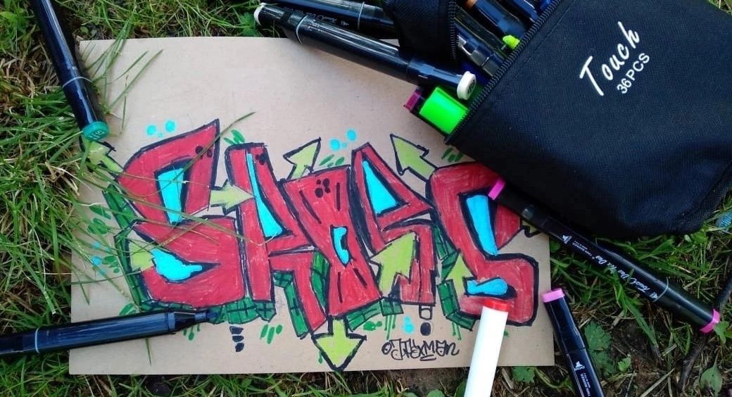 Алексей Колбасов: Однажды я случайно в интернете увидел яркие рисунки в виде шрифтов. Они были выполнены на зданиях, а также на бумаге. Заинтересовался, что же это такое. Оказалось, что это – граффити. Относятся такие рисунки к стрит-арту. Мне захотелось узнать больше. Я стал изучать шрифты — находил в интернете и старался их повторить на бумаге. Было интересно- получится или нет. Потом я придумал и свой шрифт. Может быть, я внесу в него изменения, но пока использую этот вариант. Мне очень нравятся изучать материалы , которые используются при создании граффити. Например, маркеры. Они бывают разных видов, у меня один из любимых — помповый маркер (его ещё называются «шваброй»). Также много и «заправ» для маркеров. Такие материалы можно купить в специальных магазинах, или постараться сделать самому. Как-то я посмотрел видеоролик и сделал «заправу», но получилось не очень удачно, хочу такой опыт повторить. А вот сделать маркеры получилось! Я сделал маркер сквизер из губки для мытья посуды и баночки от мыльных пузырей, а ещё маркер роллер болл из баночки от клея-роллер.
