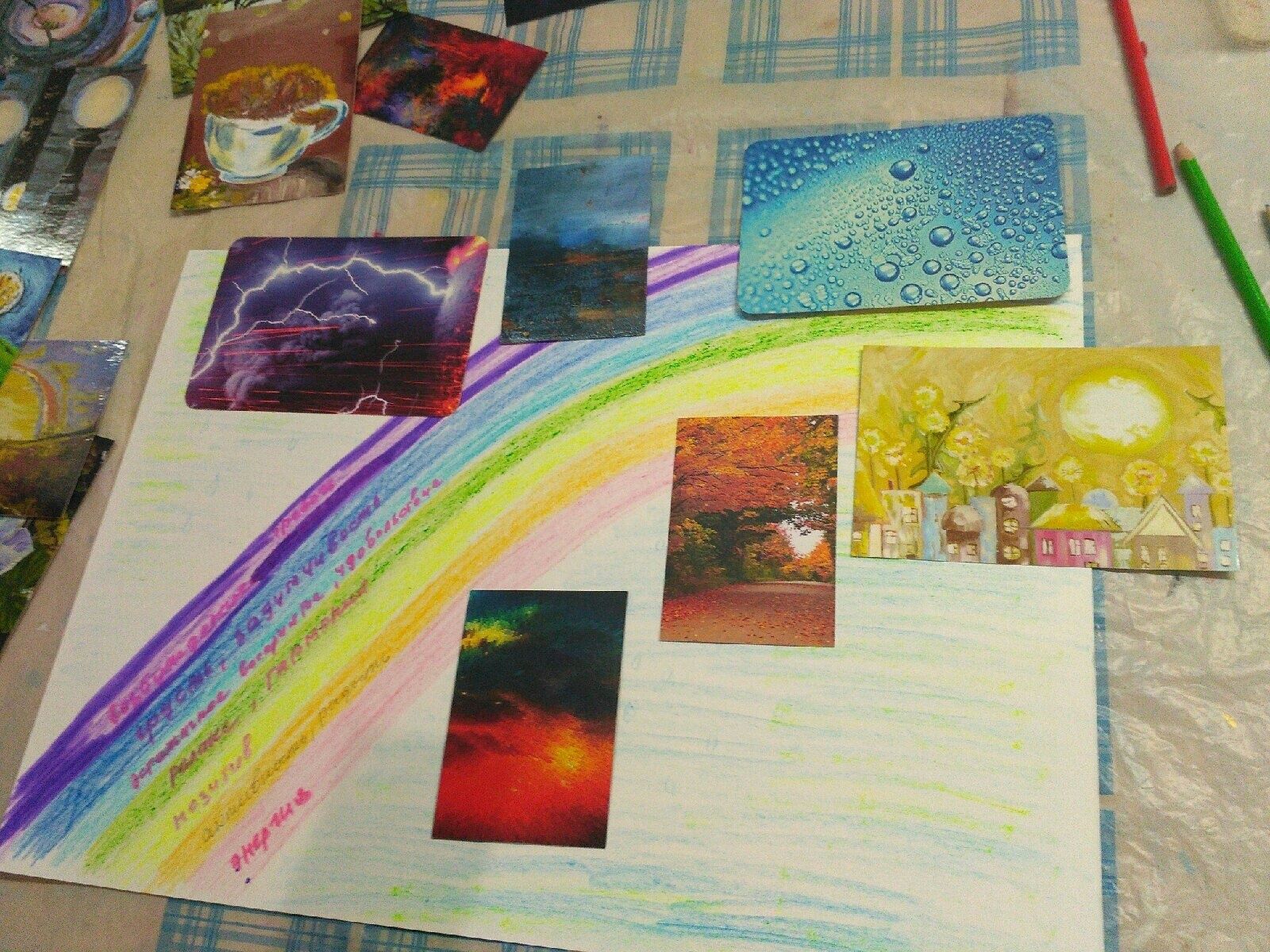 5. Подберите к каждой «цветной эмоции» образ из колоды метафорических карт. Если у вас нет таковых, можно подобрать образы из своих фотографий, открыток, репродукций картин, картинок из календарей и т.д. Получится семь образов.