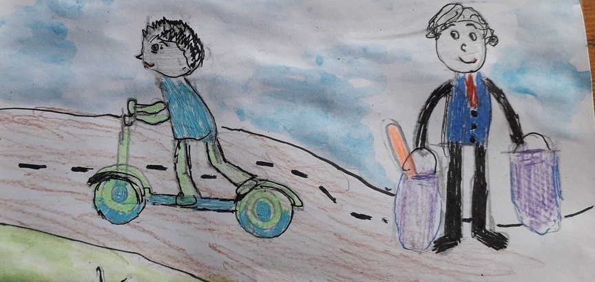 По улице шёл папа, а рядом с ним ехал на самокате сынок, лет трёх. В какой-то момент малыш устал, и папа стал помогать ему. Одной рукой он подталкивал самокат, а в другой у него была объёмная сумка с продуктами.