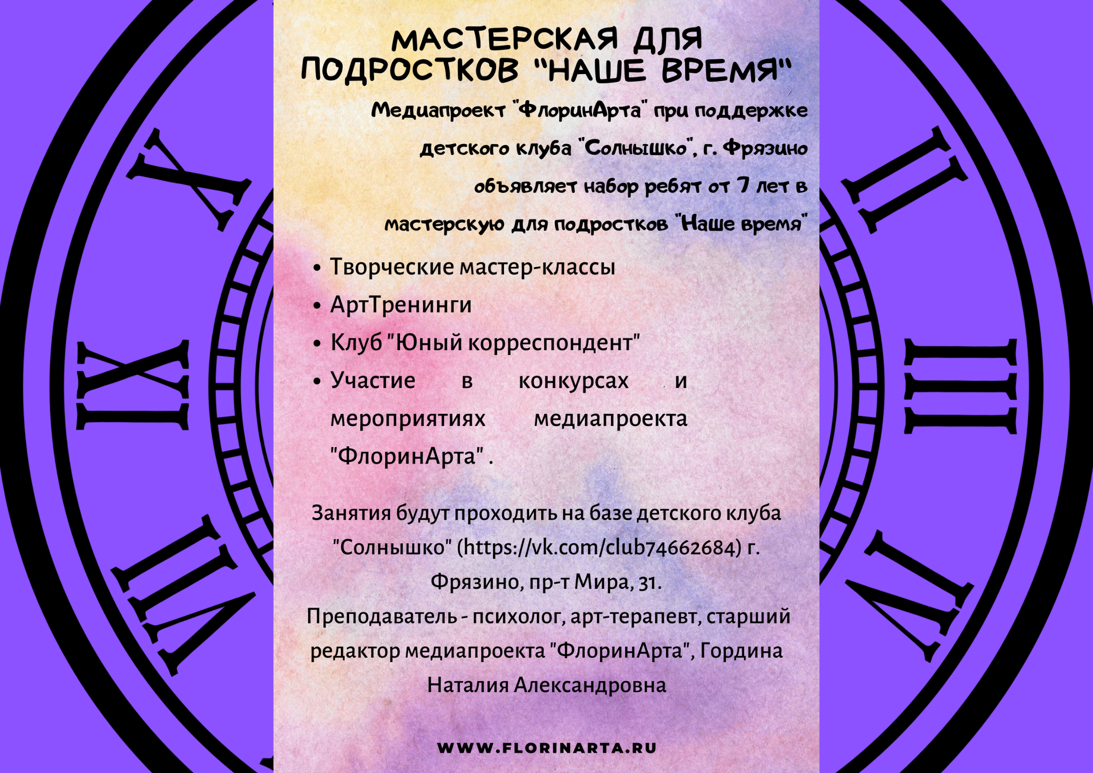 Хотим сообщить, что в рамках медиапроекта «ФлоринАрта», на базе детского клуба «Солнышко», г. Фрязино, открывается мастерская для подростков «Наше время».