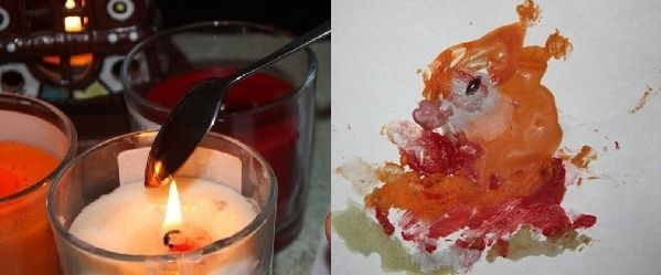 — Можно  хаотично выливать  воск  на бумагу. В этом случае  интересно угадывать в очертаниях, что именно получилось (наподобие  кляксографии, когда используются случайные эффекты и рисунок рождается словно сам по себе).  В заключительной части работы какие-то детали можно дорисовать, на чём-то сделать  акцент (украсить и пр.)
