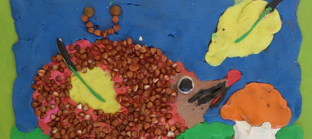 Очень любит работать с пластилином и создавать изображения различных транспортных средств. Две его работы на тему осеннего леса созданы в технике пластилинографии, для изображения ежика также использовалась гречневая крупа. А, самая трудоемкая его работа – танк, создана из спичек.