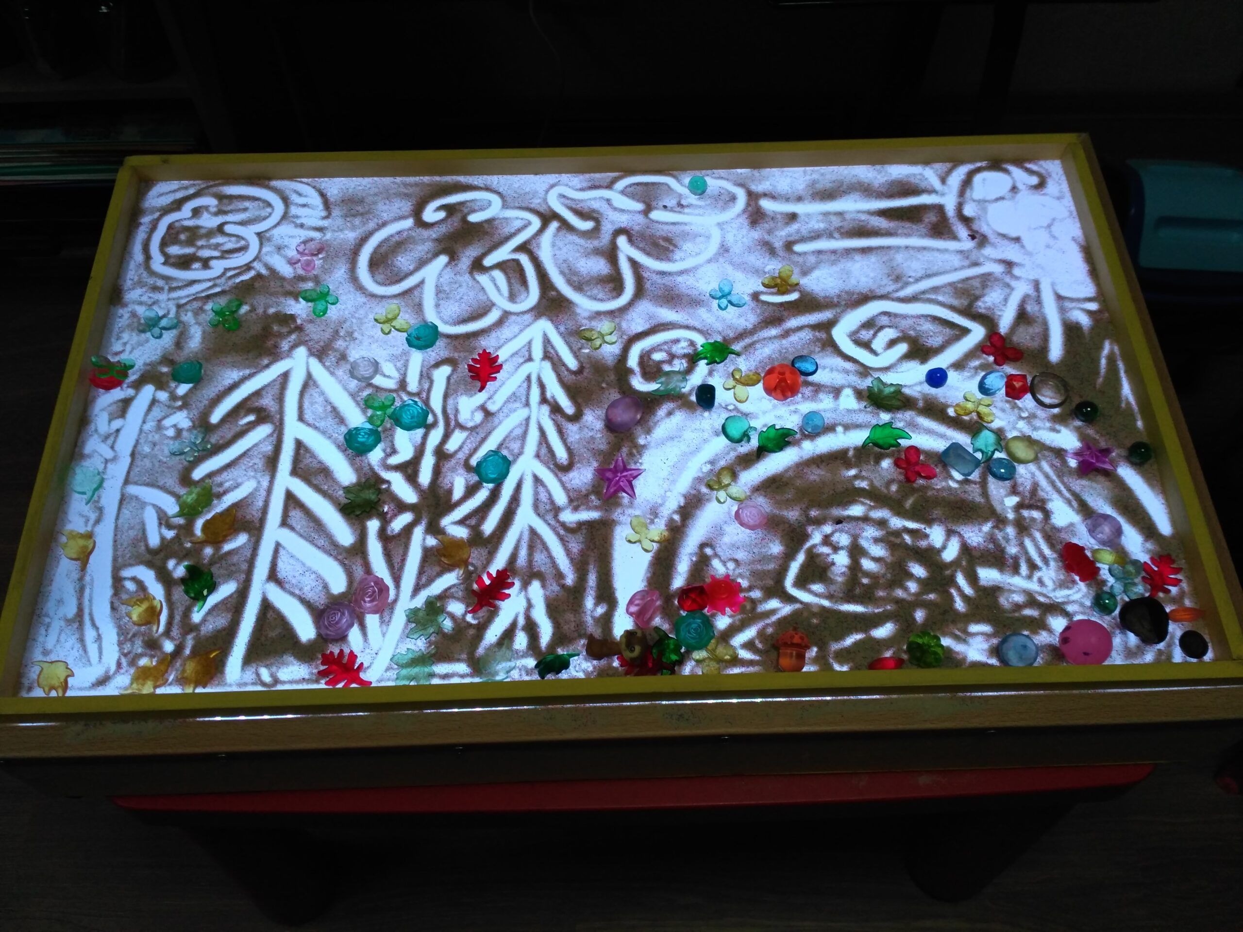 С помощью песка и света можно создавать настоящее волшебство. Стоит подключить фантазию и на световом столе расцветают сказочные сюжеты, сменяются времена года. Даже обычный кварцевый песок, с помощью детских, да и взрослых рук и фантазии, превращается в нечто необыкновенное. А если добавить цветной песок и различные красивые бусины, шарики и камушки — тут уже возникает целый мир.