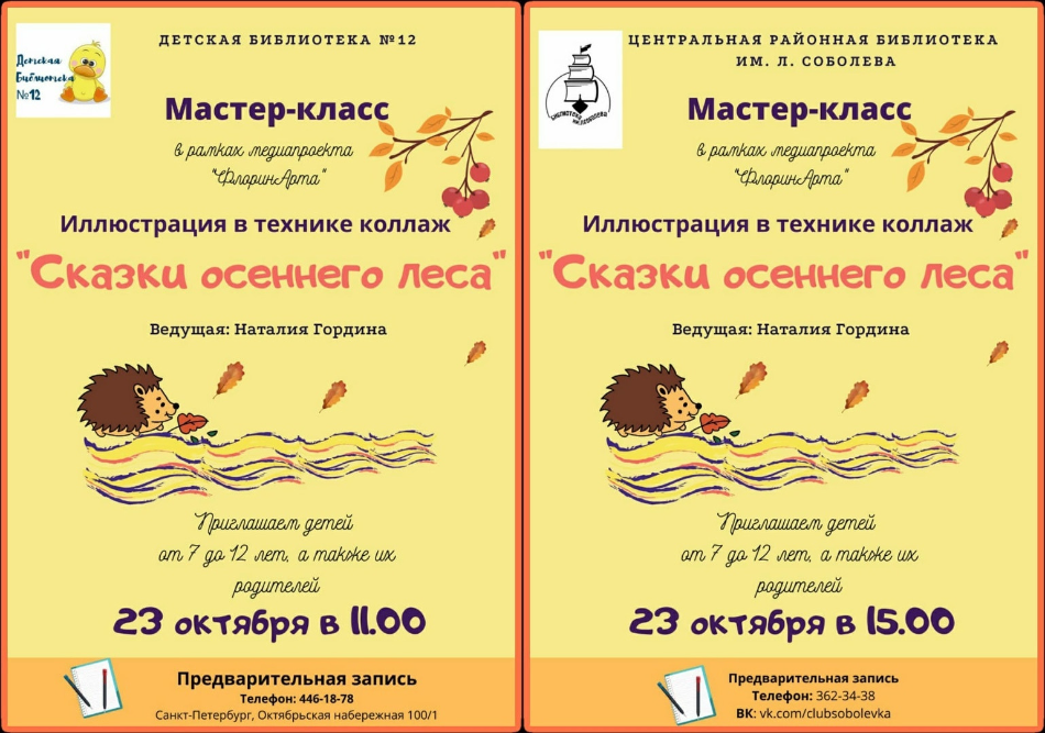 В детской библиотеке 12 и в центральной районной библиотеке им Л.Соболева ребятам вместе с родителем создавали свои иллюстрации в технике коллаж. Помогала им в этом увлекательном деле ведущая, психолог, старший редактор медиапроекта «ФлоринАрта» Гордина Наталия Александровна.