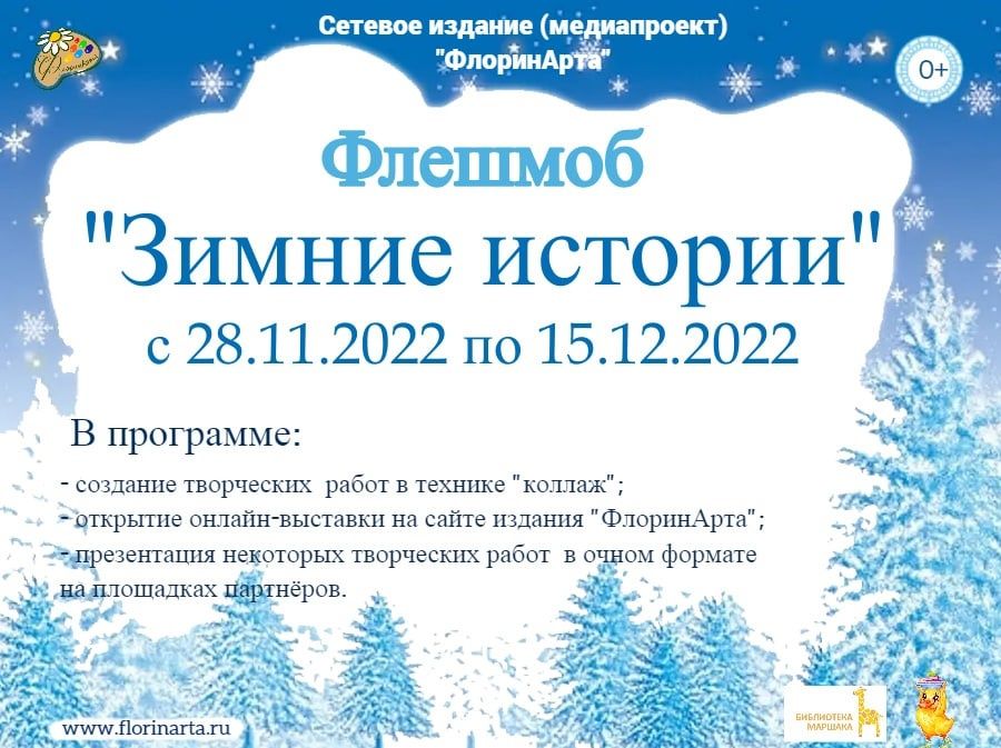 6.2. Творческие работы размещаются в фотоальбоме – флешмоб «Зимние истории» в официальной верифицированной группе сетевого издания (медиапроекта) «ФлоринАрта» в социальной сети «ВКонтакте» vk.com/florinarta