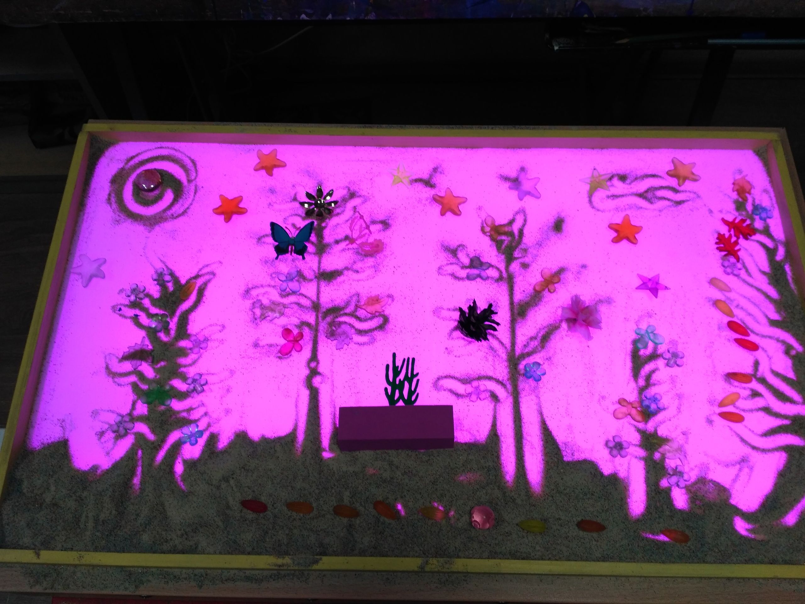 На световом столе можно играть также, как и в классической песочнице. Здесь добавляется игра света. А если стол имеет несколько цветовых режимов, с его помощью можно делать акценты на таких нюансах, как время суток, время года, различные места на планете (луг, море, пустыня).