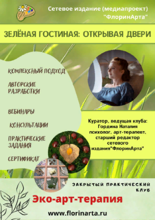 В рамках сетевого издания (медиапроекта) «ФлоринАрта» c 16 по 22 мая прошла авторская тематическая неделя старшего редактора, руководителя направления «Эко-арт-терапия», психолога Наталии Гординой «Зелёная гостиная. Погружение в эко-арт-терапию».