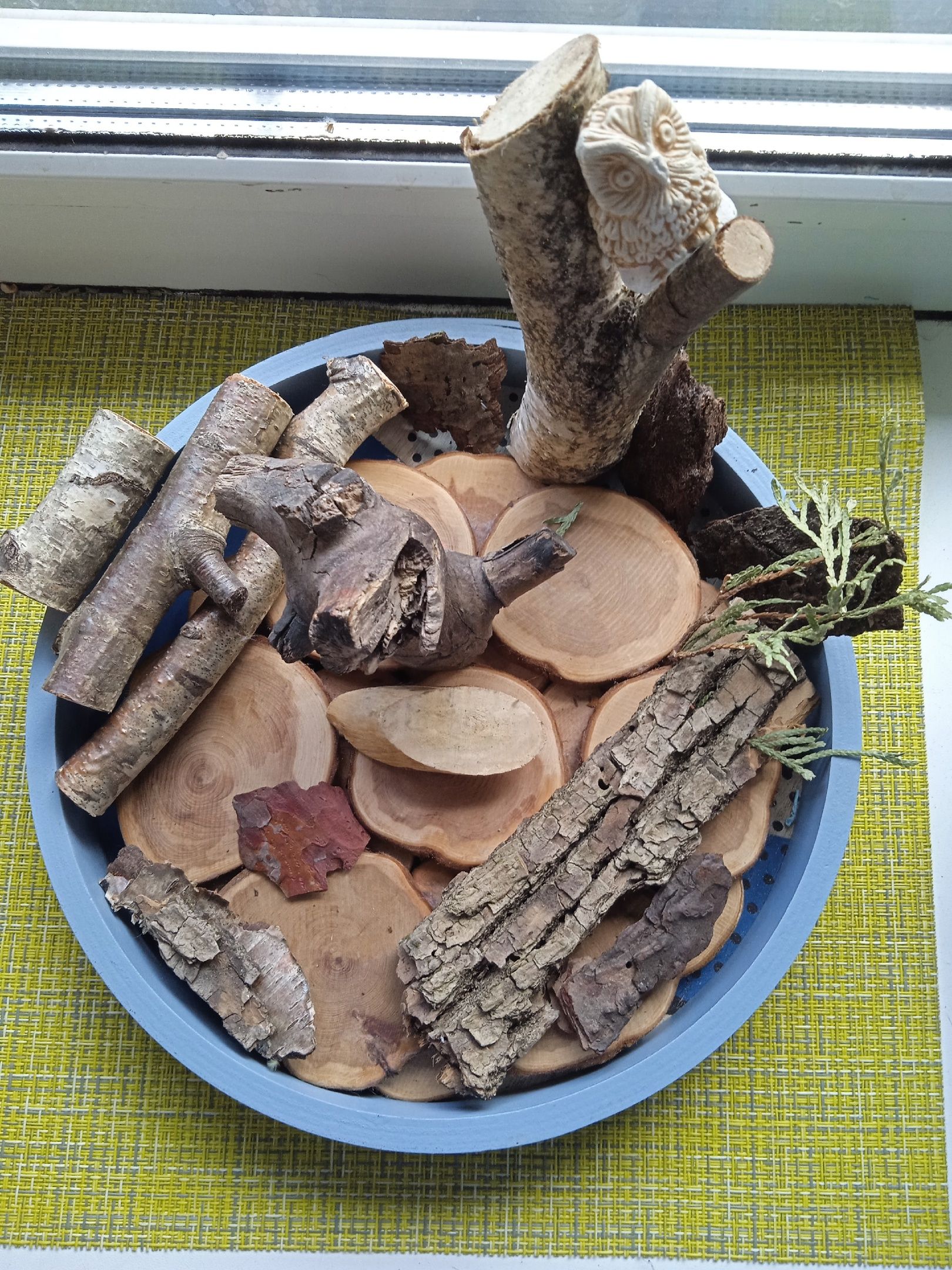 Возраст: школьники, подростки, взрослые. Цели практики: снятие напряжение, поиск ресурсов, самопознание. Материалы: круглый поднос (тарелка, круг из картона, подставка), натуральное дерево (кора, спилы, ветки со старых деревьев), минимально обработанные деревянные изделия небольшого формата, деревянные бусины (натурального цвета).