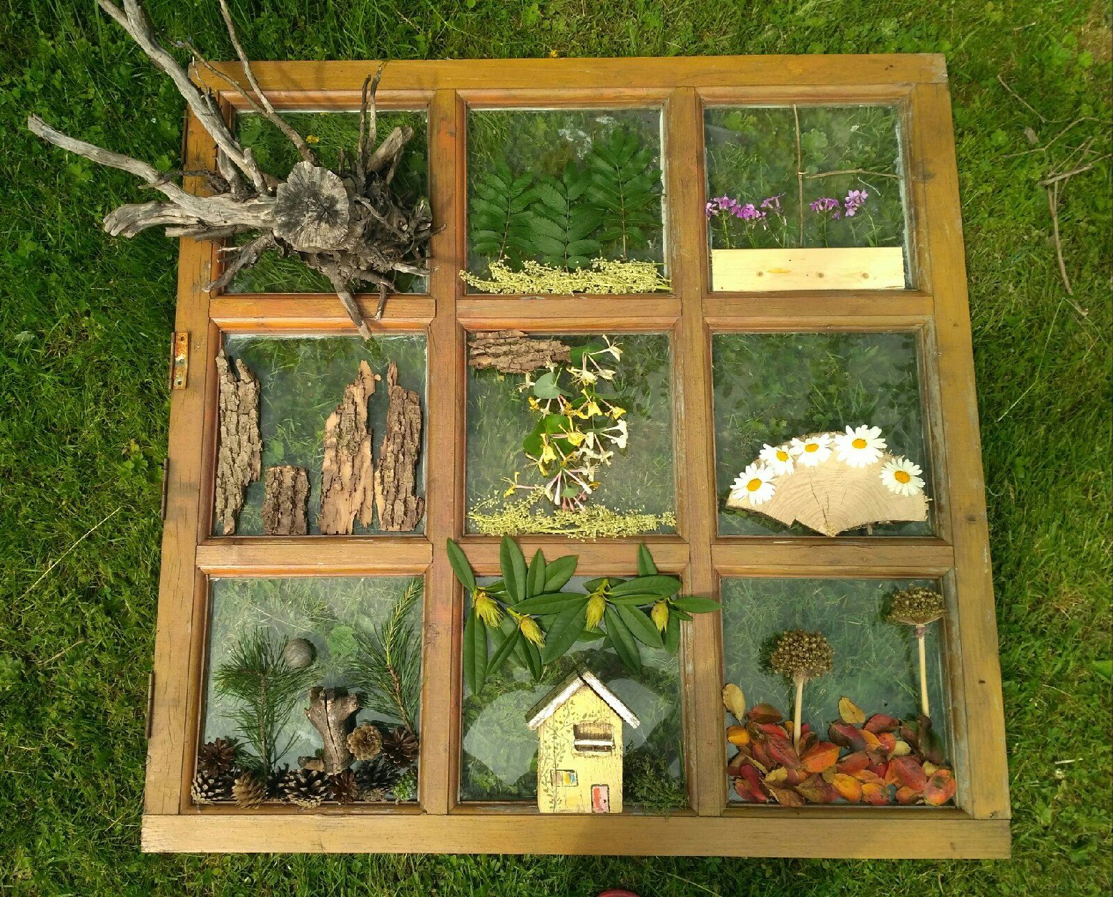 Сегодня мы хотим представить вам инсталляцию, под названием «Галерея живых картин». Здесь использованы различные природные материалы, такие как: шишки, опавшие листья, сухоцветы, кора от старого дерева, сосновые веточки и т.д., а также старая рама от окна. Получилась целая серия живых картин. Такую серию можно сделать и с помощью самодельных рамок, созданных из веточек, песка, камней, коры, а также картона или бумаги. Можно взять тему, которая будет объединять картины, либо взять разные темы.