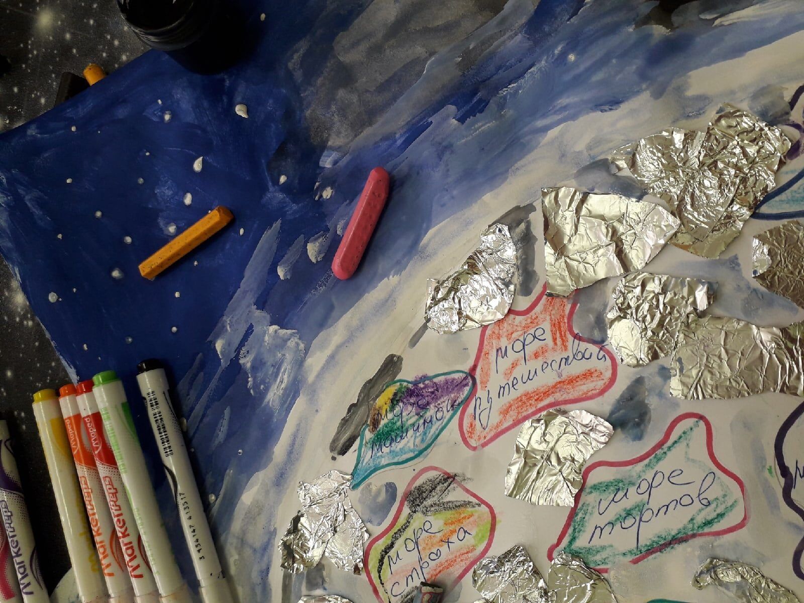 Материалы: карта Луны; видеосюжеты о космосе и исследования Луны, Лунных морей; фольга; фломастеры, линеры, мелки, карандаши; клей, ножницы; элементы декора (стразы, наклейки).
