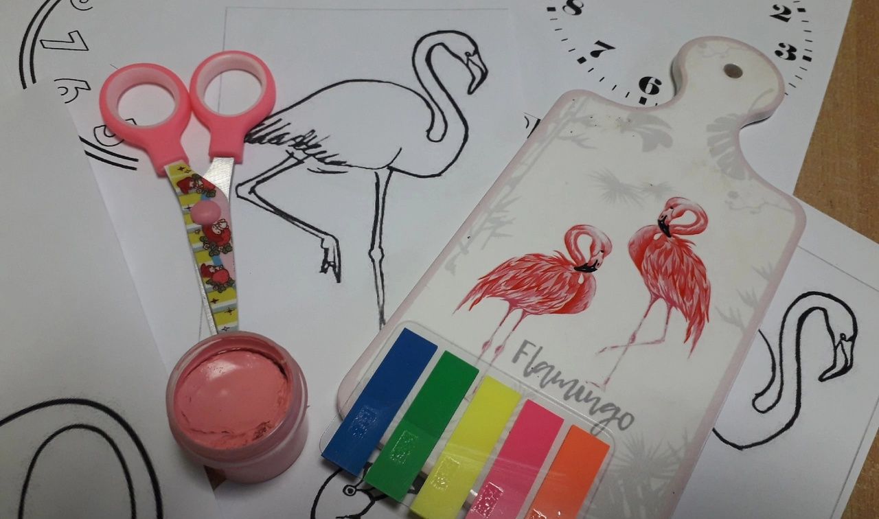 Материалы: Фото и видеоматериалы / сувениры/, песни (с использованием образа розового фламинго); готовые шаблоны (изображение розового фламинго и циферблата часов, формат не менее А5); краски (гаушь /акрил, обязательное наличие розового, красного, бордового и белого цветов); палитра для краски или отдельный плотный лист бумаги белого цвета; бумага для рисования (формат не менее А4); клей; другие принадлежности для рисования и материалы для творчества (например, элементы декора); стикеры (досточно узкие и небольшие)